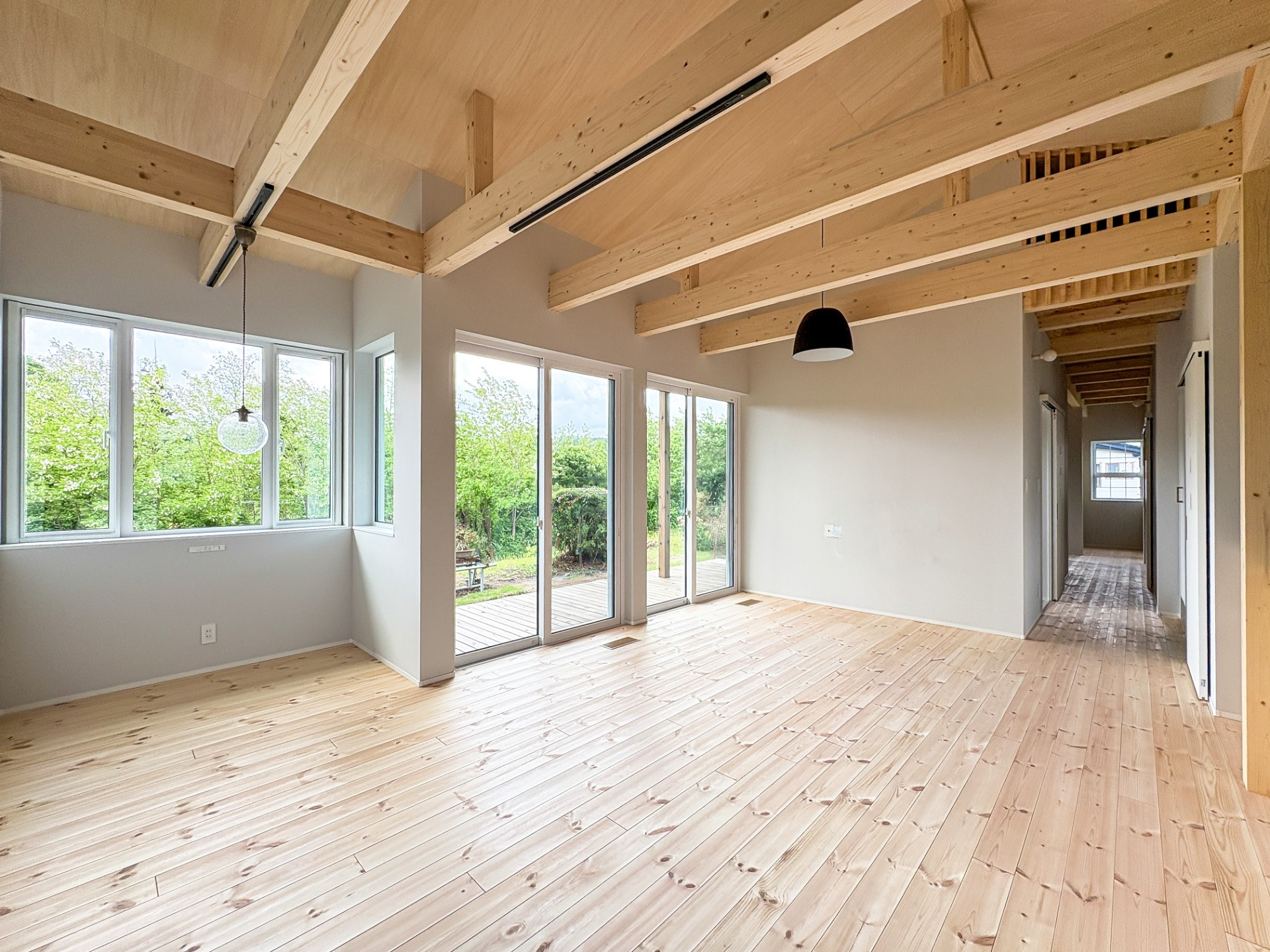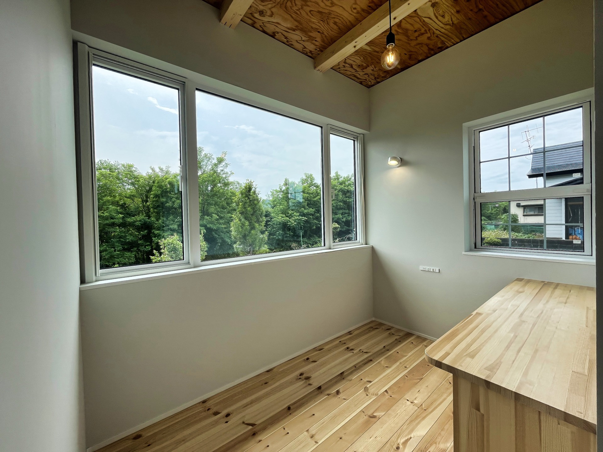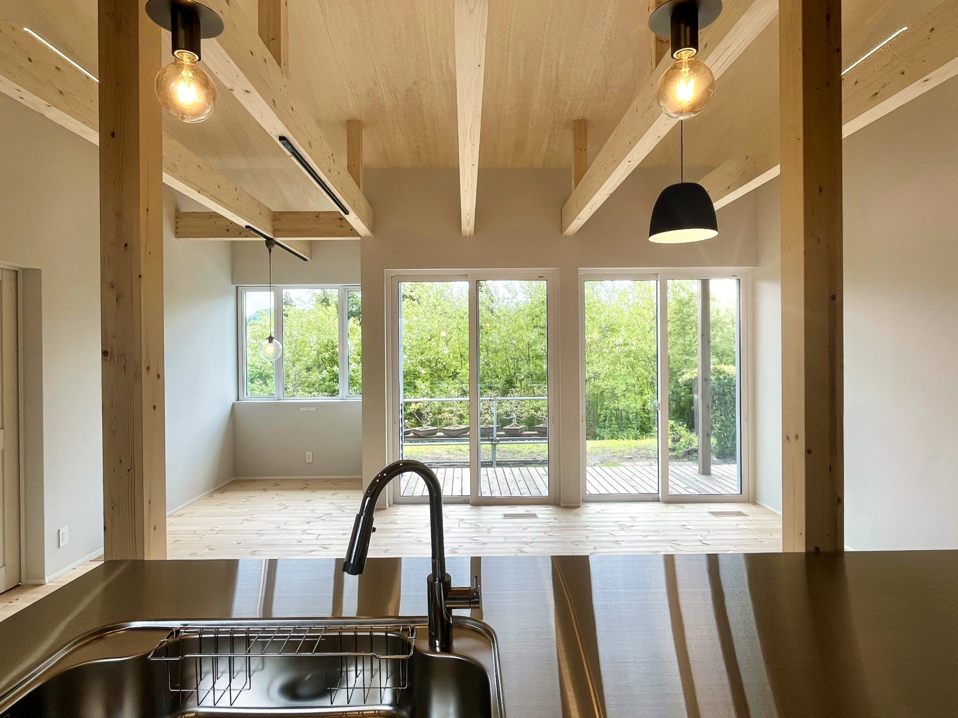 リビングの窓から広がるのは、豊かな緑と開放的な景色。