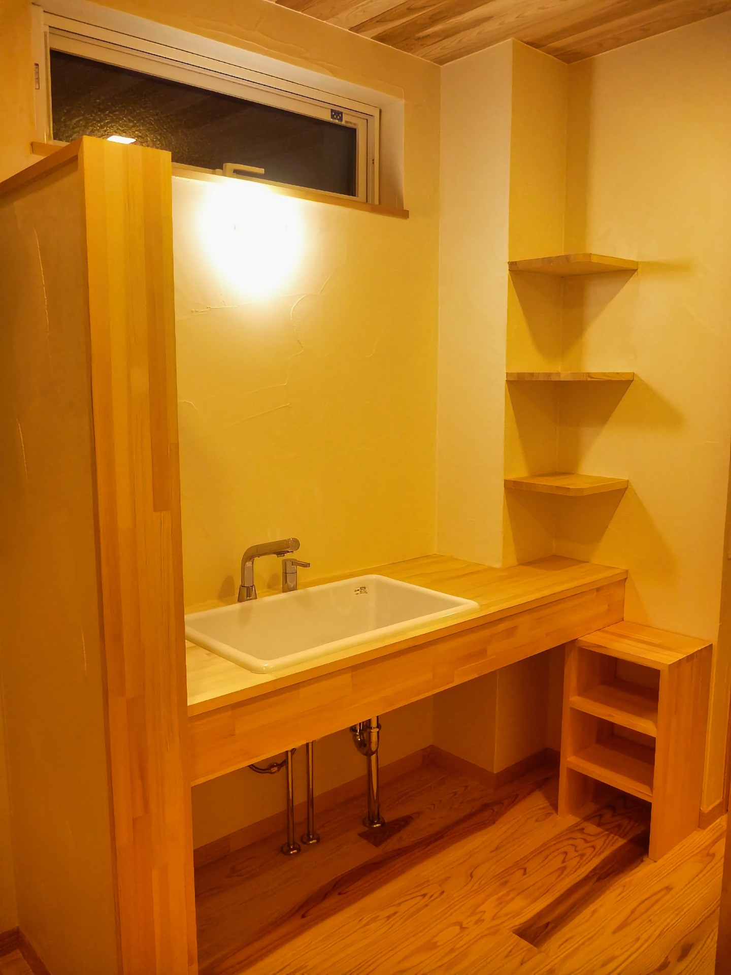 毎日立つ洗面カウンターには、温かみのあるパイン材の造作を。